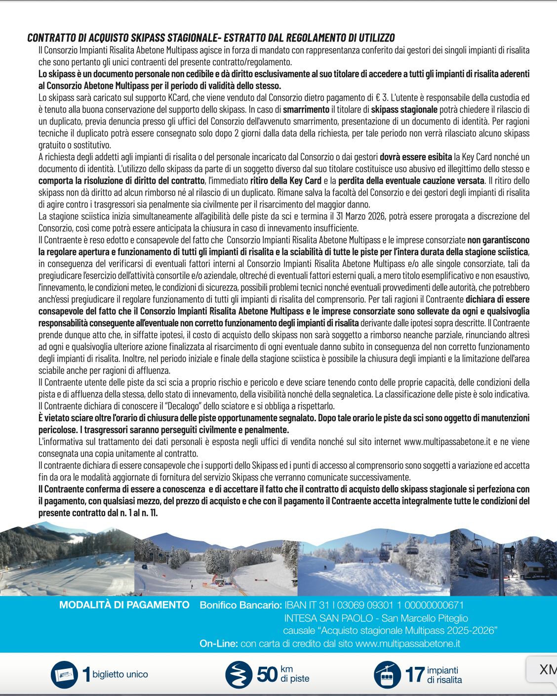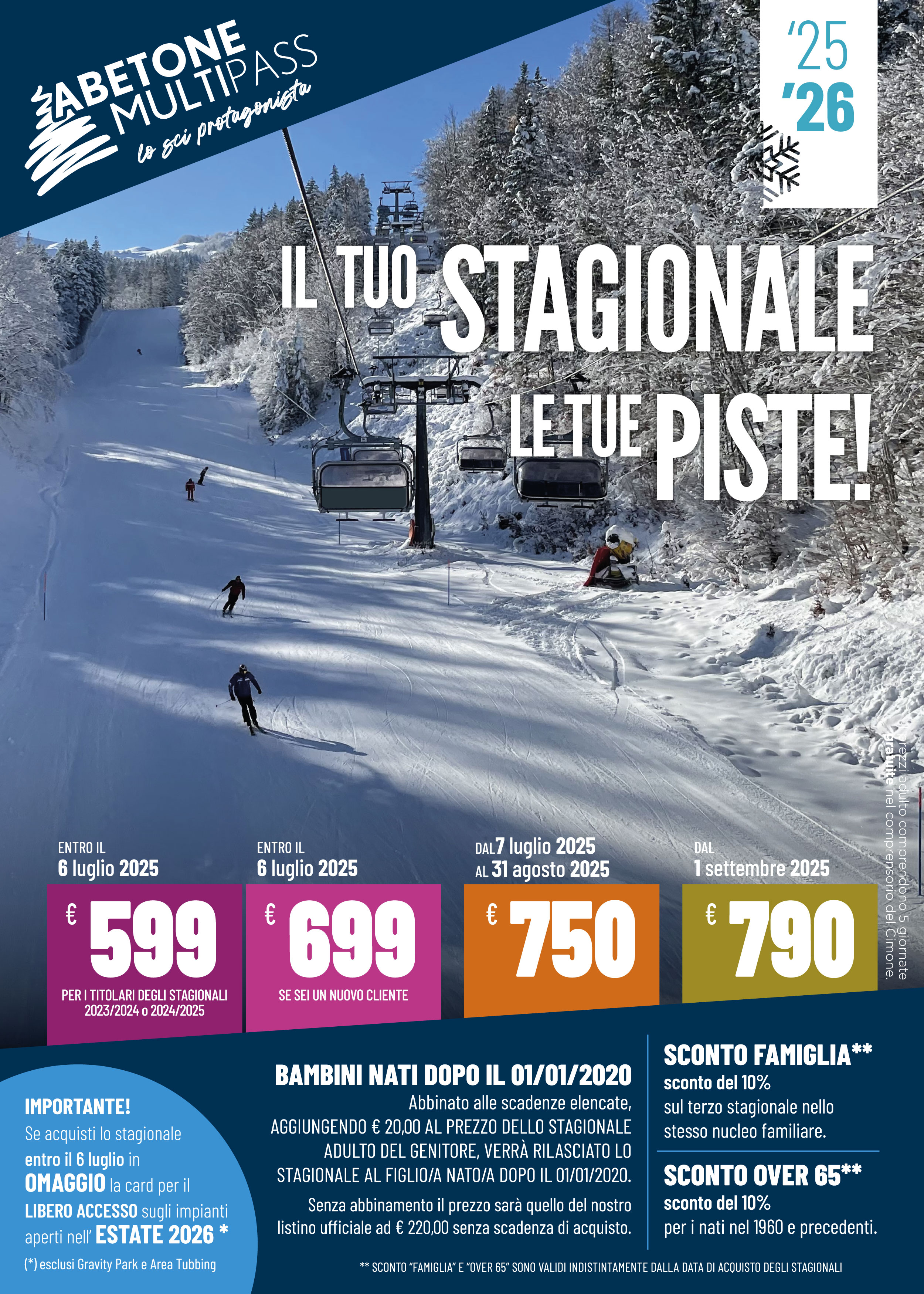 o Bambini nati dopo 01/01/2018 plurigiornalieri da 2gg a 7gg - 2.00€ al giorno abbinati all’adulto pagante. Occorre l’attestazione dell’età tramite documento. Questa iniziativa si applica dal 07/01/2026 fino a fine stagione.
